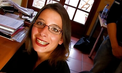 法国眼镜的女孩米拉和她的巨大的奶子回来在镜头前